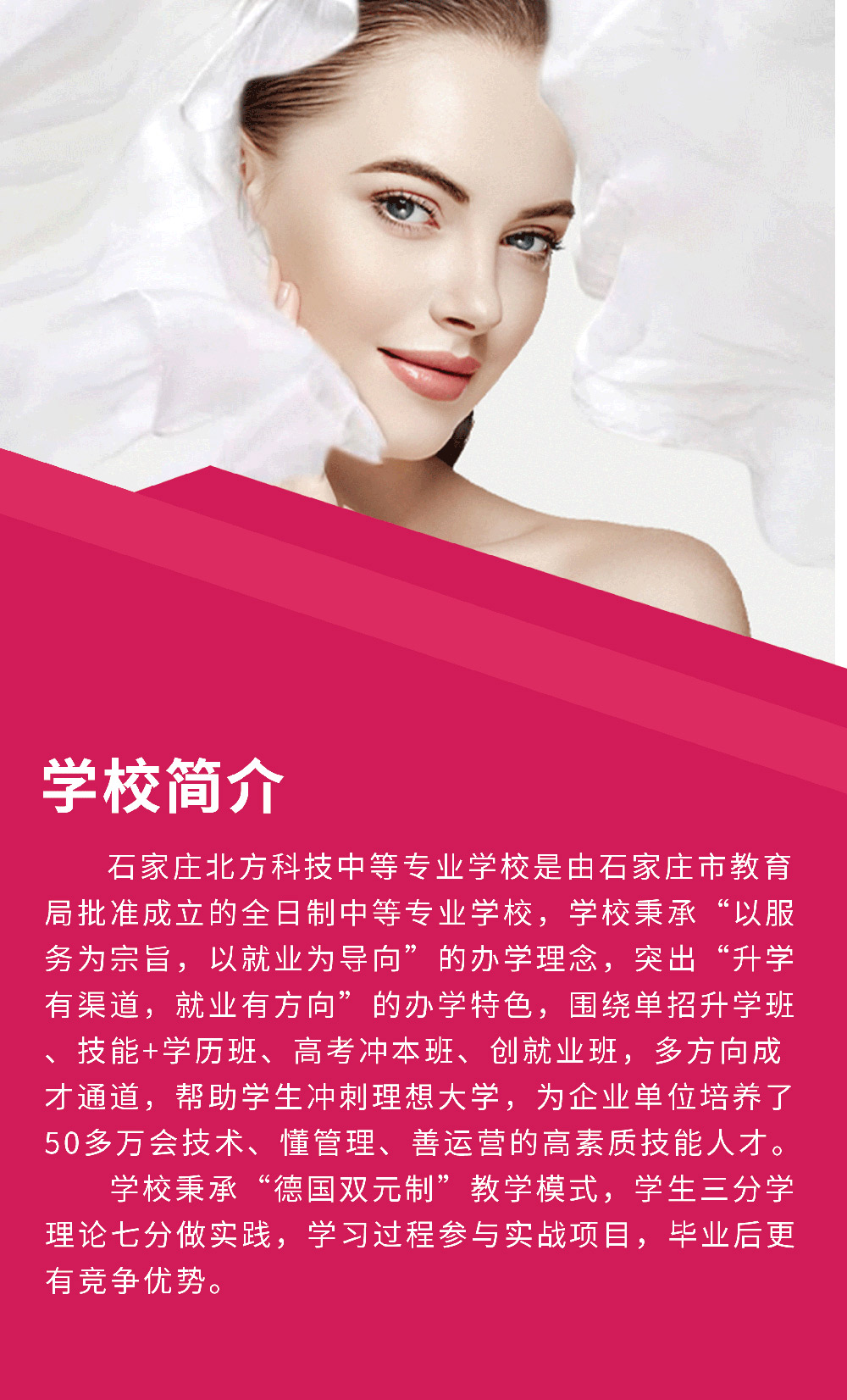 石家庄北方形象设计专业 包含美妆,造型,美容美体,医美,美甲,美睫,礼仪美学等课程,致力于打造全能型美业人才!