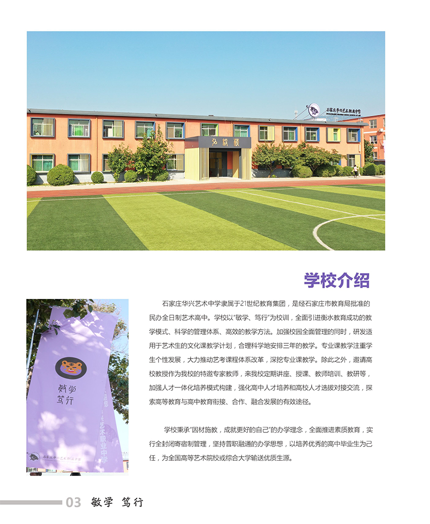 石家庄华兴中学隶属于21世纪教育集团,是经石家庄市教育局批准的民办全日制综合高中。学校以"敏学、笃行"为校训,全面引进衡水教育成功的教学模式、科学的管理体系、高效的教学方法。加强校园全面管理的同时,研发适用于艺术生的文化课教学计划,合理科学地安排三年的教学。专业课教学注重学生个性发展,大力推动艺考课程体系改革,深挖专业课教学。除此之外,邀请高校教授作为我校的特邀专家教师,来我校定期讲座、授课、教师培训、教研等加强人才一体化培养模式构建,强化高中人才培养和高校人才选拔对接交流,探索高等教育与高中教育衔接、合作、融合发展的有效途径。