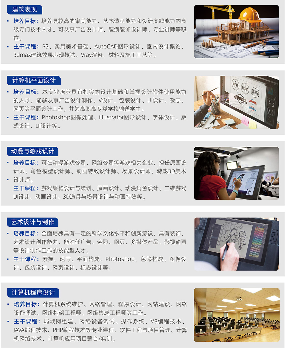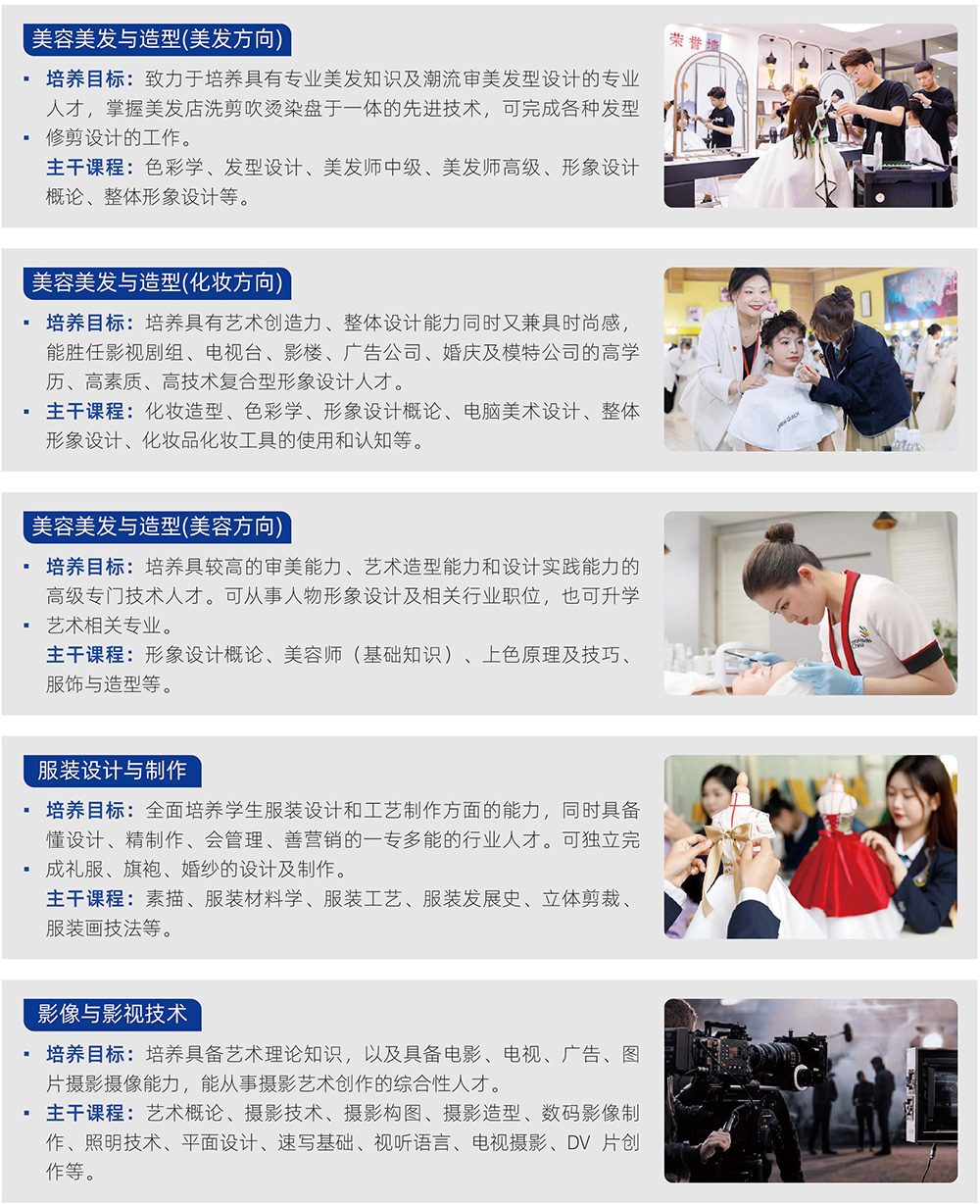 妆与形象设计,美发与形象设计,美容美体,计算机应用与管理,电子商务,室内设计与装潢,航空服务,摄影摄像技术。