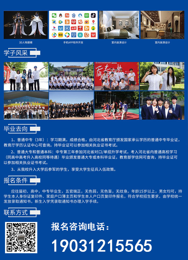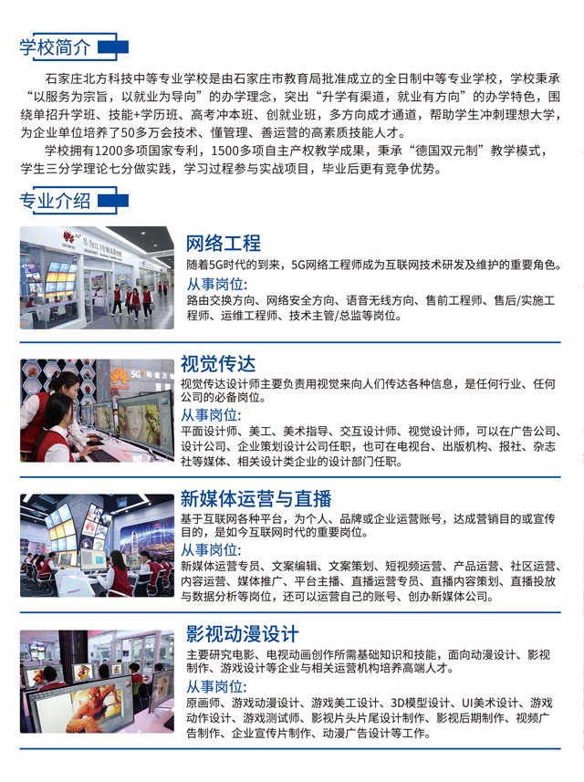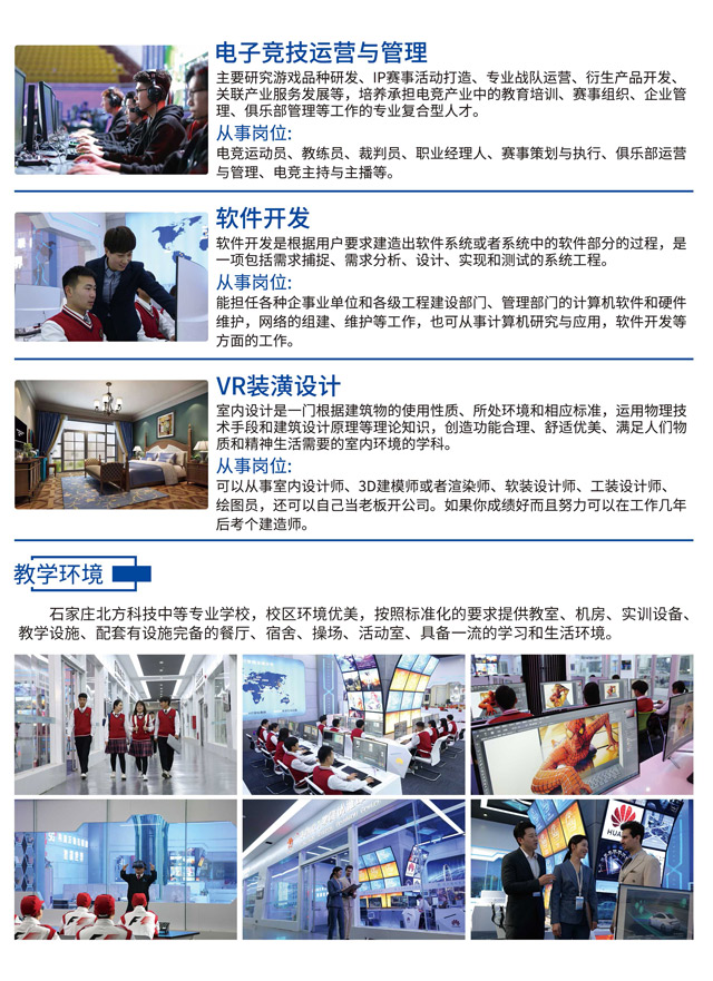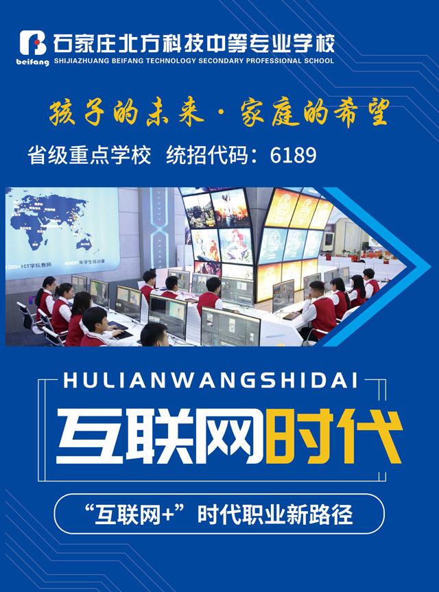 石家庄北方科技中等专业学校为了满足市场推动产业转型升级的工业互联网需求,强势推出七大新兴专业,包括网络工程、软件开发、影视动漫设计、视觉传达、电子竞技运营与管理、新媒体运营与直播、VR装潢设计,旨在为各企业和事业单位培养会技术、懂管理、擅运营的实用型、综合型IT专业人才。